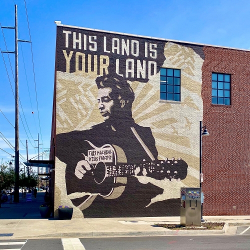 This mural is painted on the side of the Woody Guthrie Center in Tulsa, Oklahoma. Guthrie, an Oklahoma native, was an American singer and songwriter who is considered to be one of the most significant figures in American folk music. His songs expressed a native radicalism that criticized private property, spoke on poverty and rural life, and were anti-fascist. His most famous song, "This Land is Your Land," is painted across the top of the mural, and a sticker shown on his guitar with the famous saying "This Machine Kills Fascists." These two phrases have not only become associated with Woody Guthrie's life and career, but have influenced various anti-fascist, anti-racists, and anti-capitalist movements throughout the United States.