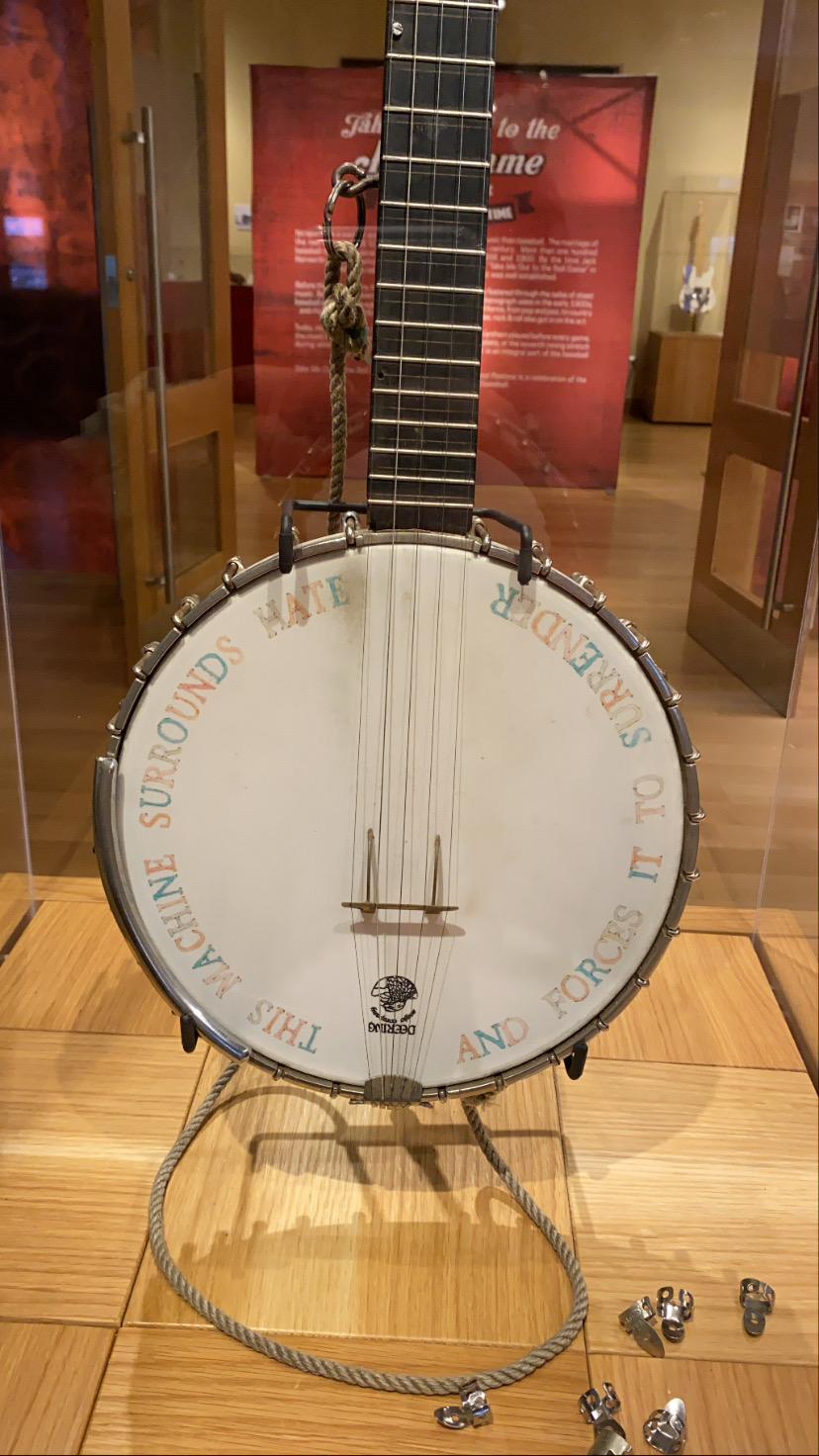 This image depicts one of Pete Seeger's banjos displayed, at the Woody Guthrie center in Tulsa, Oklahoma, with the inscription, "This machine surrounds hate and forces it to surrender." Seeger, inspired by Woody Guthrie, was one of the most prominent American folk singers and social activists. This banjo's inscription is both a tribute to Guthrie, and a continuation of his message into the second half of the 20th century as Seeger continued to spread his anti-capitalist, anti-racist, and anti-fascist message through folk music.